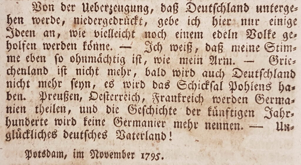 Von der Ueberzeugung, daß Deutschland untergehen werde, niedergedrückt, gebe ich hier nur einige Ideen an, wie vielleicht noch einem edeln Volk geholfen werden könne. … Die Geschichte der künftigen Jahrhunderte wird keine Germanier mehr nennen. – Unglückliches deutsches Vaterland!