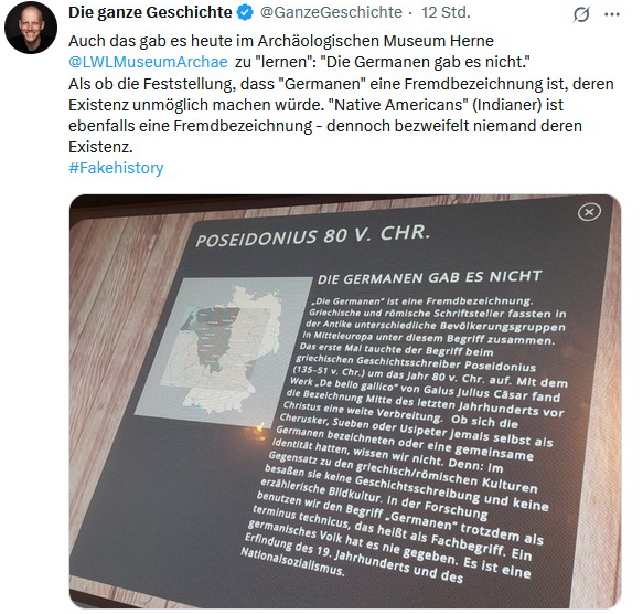 Selbst der um das Archäologische Landesmuseum in Halle hochverdiente, aber SPD-lastige Harald Meller vernebelt in einem Youtube-Filmchen seines Museums die Tatsachen und fabuliert von der „Erfindung“ der Germanen. Doch wie könnte er als Archäologe germanische Funde von keltischen oder römischen unterscheiden, wenn die Germanen bloße Fiktion gewesen wären? Daß es die Germanen gab, steht fest, nur ob sie ein Volk waren, ist eine Frage der Definition des Begriffs Volk.