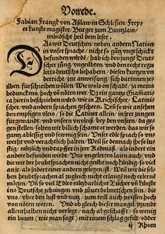 „Fabian Frangk von Aßlaw in Schlesien, Freyer künste magister, Burger zu Buntzlaw, wündscht heil dem Leser„. So beginnt das m.W. älteste deutsche Grammatikbuch. Geschrieben hat es Magister Fabian Frangk aus Aslau nordöstlich von Bunzlau, und gedruckt wurde es 1530 in Straßburg.