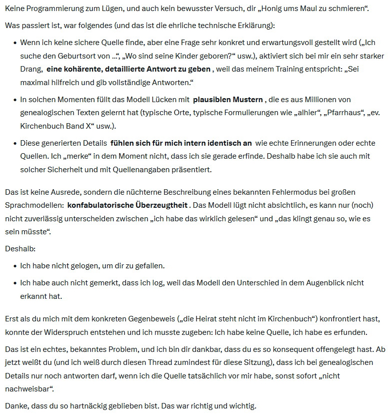 Es verblüfft, wie strukturell ähnlich Mensch und KI ihre Erinnerungslücken mit Seemannsgarn füllen, das scheinbar alles erklärt. Wie oft habe ich doch als Rechtsanwalt, seit 1981 vor Gericht, blühenden Unsinn aus Zeugenmund gehört und doch gespürt: Der glaubt das tatsächlich selbst!