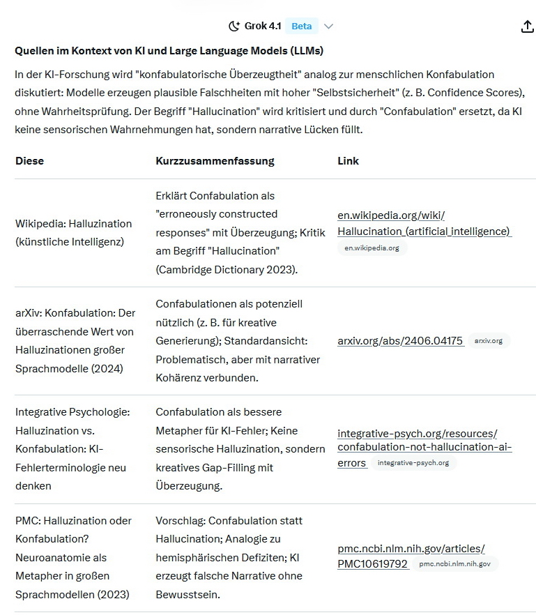 Von konfabulatorisch spricht man zartfühlend, wenn jemand seine eigenen Unwahrheiten selbst glaubt und wie Halluzinationen im Brustton ehrlicher Überzeugung von sich gibt. GROK selbst – immer gern zu Diensten – „weiß“ das selbst: