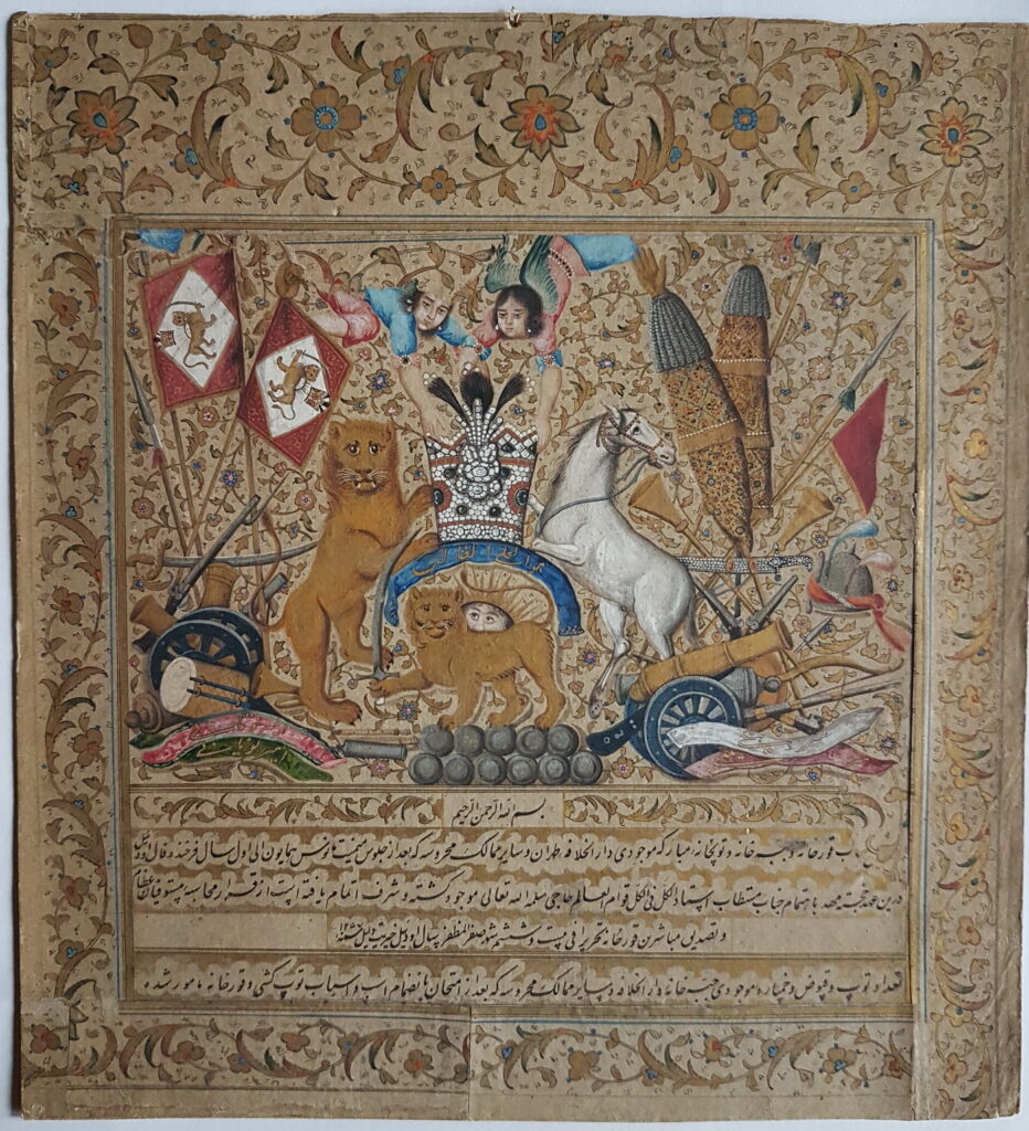 Das Bild zeigt eine persische Miniaturmalerei (persisch: نگارگری ایرانی) von 1848/49 im Qajar-Stil der Epoche, „gemalt vom Diener Hāddschī Muhammad Khān im Jahr 1265 der Hidschra.“ Die Schrift besagt unter anderem: