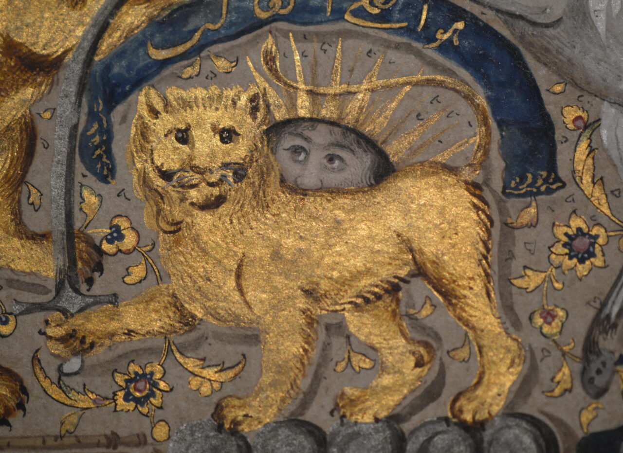 Das berühmteste Symbol für den Schah ist das Shir-o-Khorshid (Löwe und Sonne), das nationale Emblem Persiens bis 1979: Der Löwe steht für Stärke und Heldentum, die Sonne mit Gesicht für den Schah. Indem das Gesicht der Sonne klein und nur andeutungsweise sichtbar ist (hinter der Krone, über dem Löwen), wird der Schah nicht als normaler Mensch gezeigt, sondern als transzendente, himmlische Macht. Es ist keine realistische Porträtähnlichkeit, sondern eine vergöttlichende Allegorie.