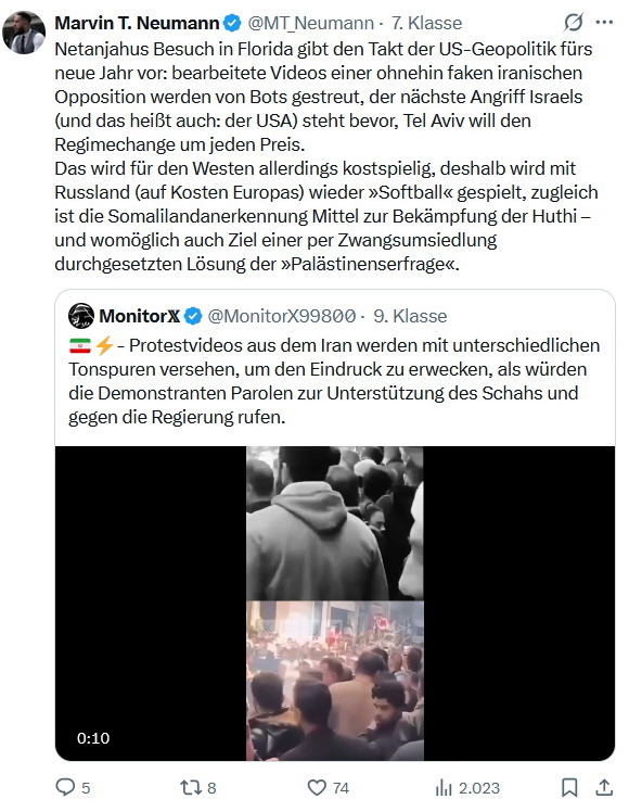 Es wäre nicht die erste Revolution, hinter der die CIA oder andere Geheimdienste stecken. Es ist kein Geheimnis, daß die Teheraner Mullahs Todfeinde haben. Es liegt aber auch in der Natur jeder Revolution, daß die Initiatoren und ersten Drahtzieher es sind, die am Ende „oben“ stehen. Wie dem auch sei: Im brodelnden Persien kann es eigentlich mittelfristig nur noch besser werden. Darin unterscheidet sich dieses Land von Deutschland.