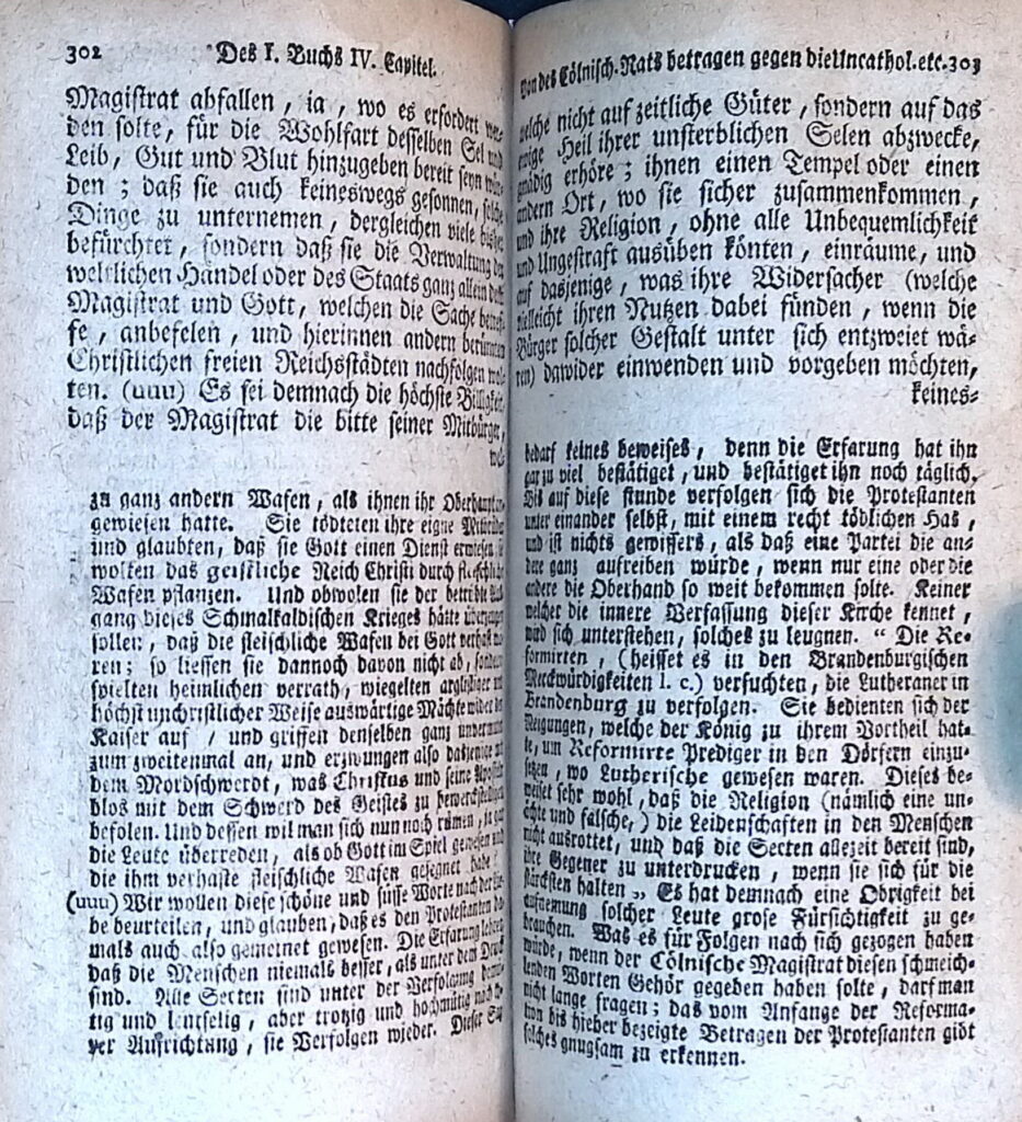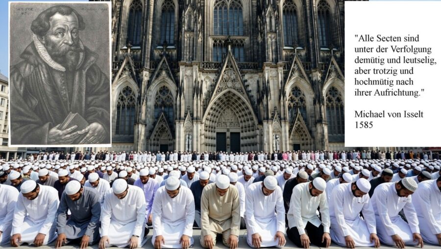 Er stand noch in einer ungebrochenen kirchengeschichtlichen Tradition: „Ich kenne kein islamisches Land, das tolerant ist. Toleranz predigt der Islam immer nur dort, wo er in der Minderheit ist.“ Wechselseitige Erfahrungen miteinander hatten die Kölner seit dem 16. Jahrhundert nämlich gemacht, und zwar katholische und evangelische. Ich hatte die Verfolgung der Protestanten und die katholische Homogenisierung hier am 3.6.2025 bereits ausführlich dargestellt: