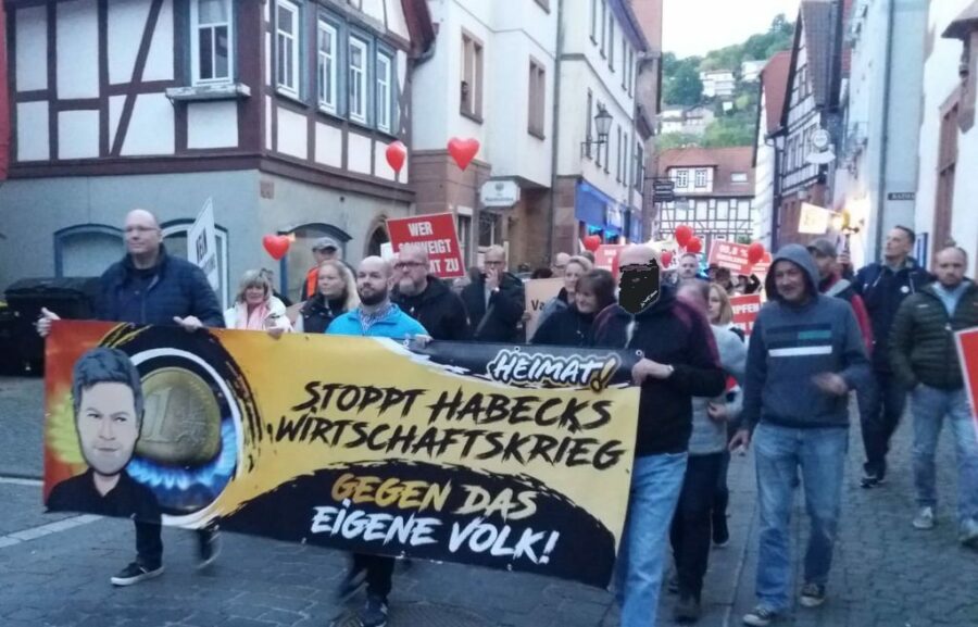 Ein Montagsspaziergang in Büdingen am 30.9.2022 wurde einem Demonstranten (Gesicht geschwärzt) fast zum Verhängnis.
